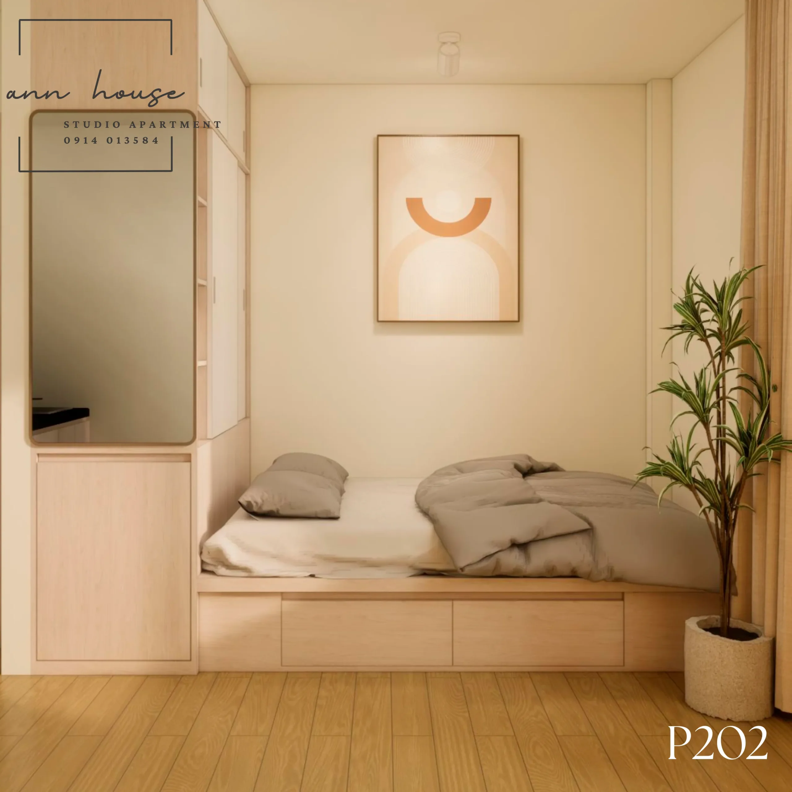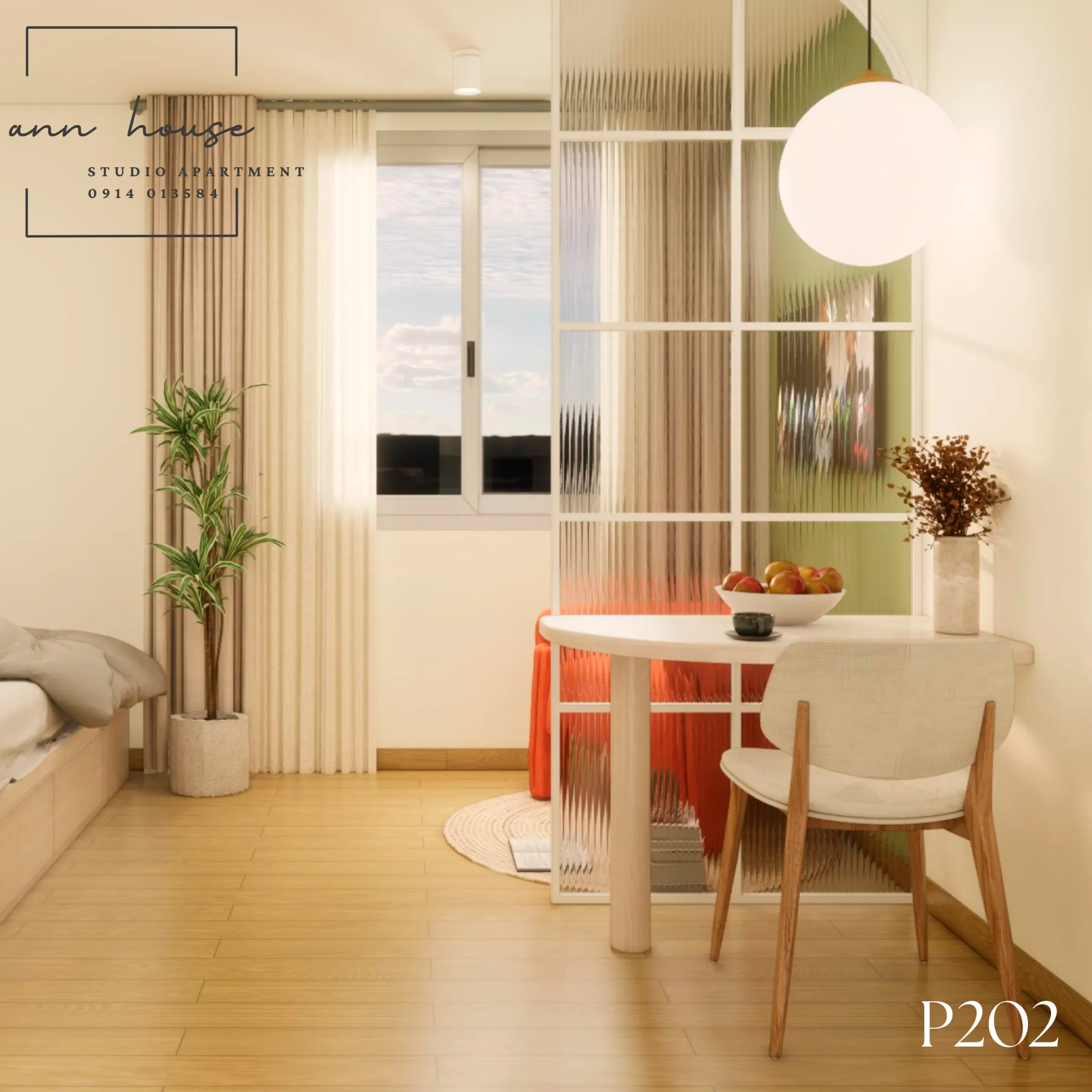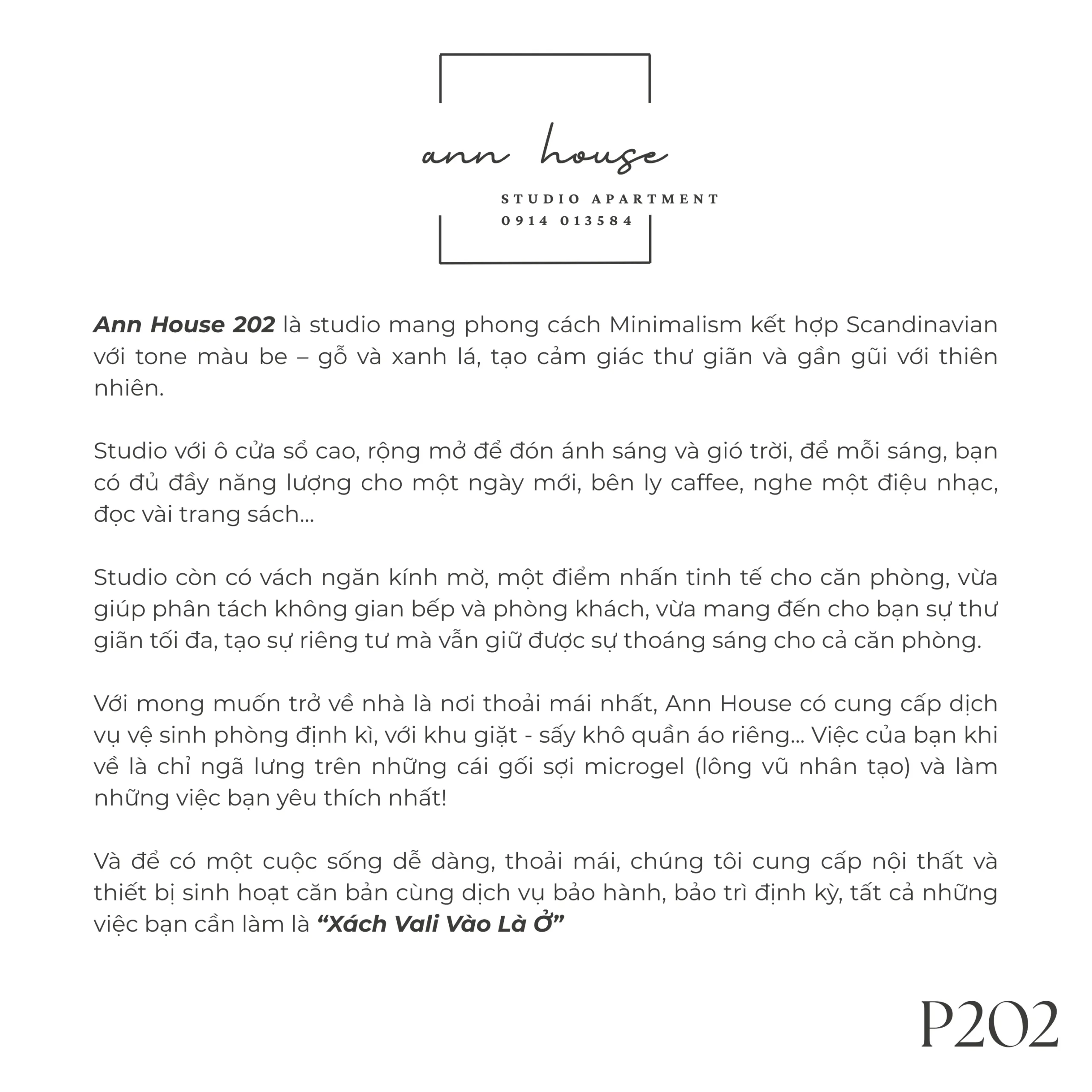 Ann House 202 là studio mang phong cách Minimalism kết hợp Scandinavian với tone màu be – gỗ và xanh lá, tạo cảm giác thư giãn và gần gũi với thiên nhiên.