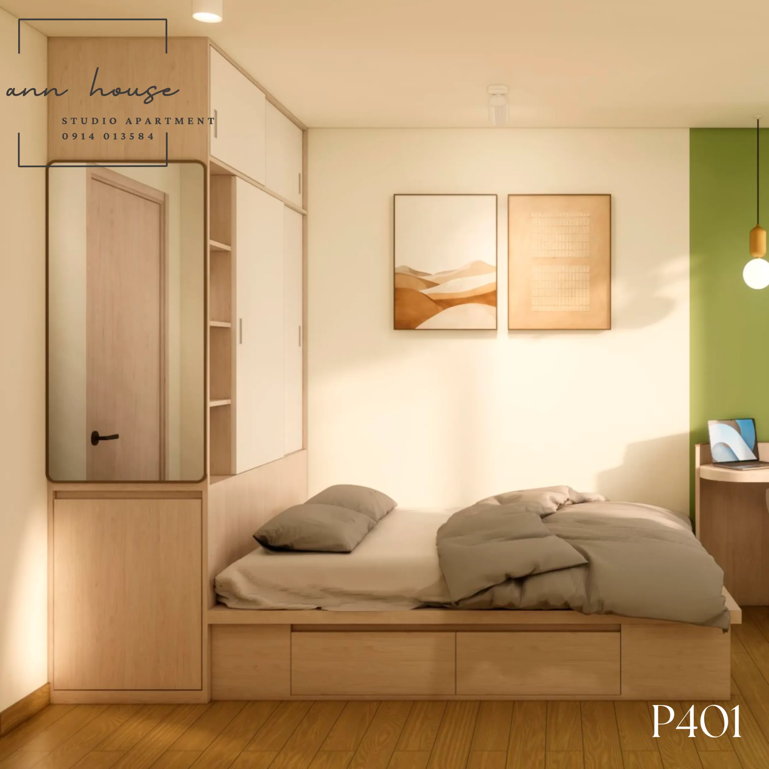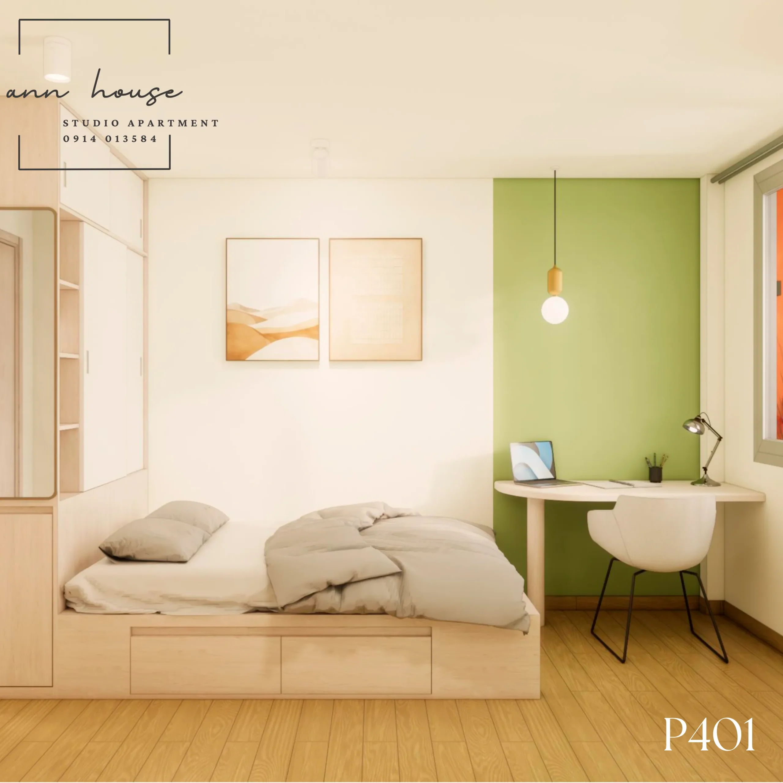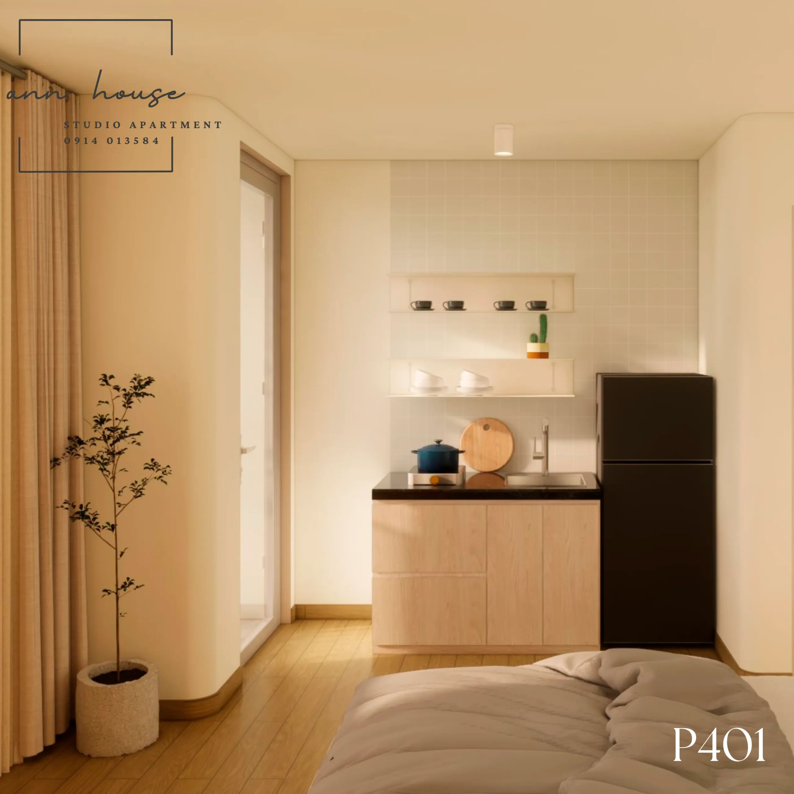 Ann House 401 là studio mang phong cách Minimalism kết hợp Scandinavian với tone màu be – gỗ và xanh lá, tạo cảm giác thư giãn và gần gũi với thiên nhiên.