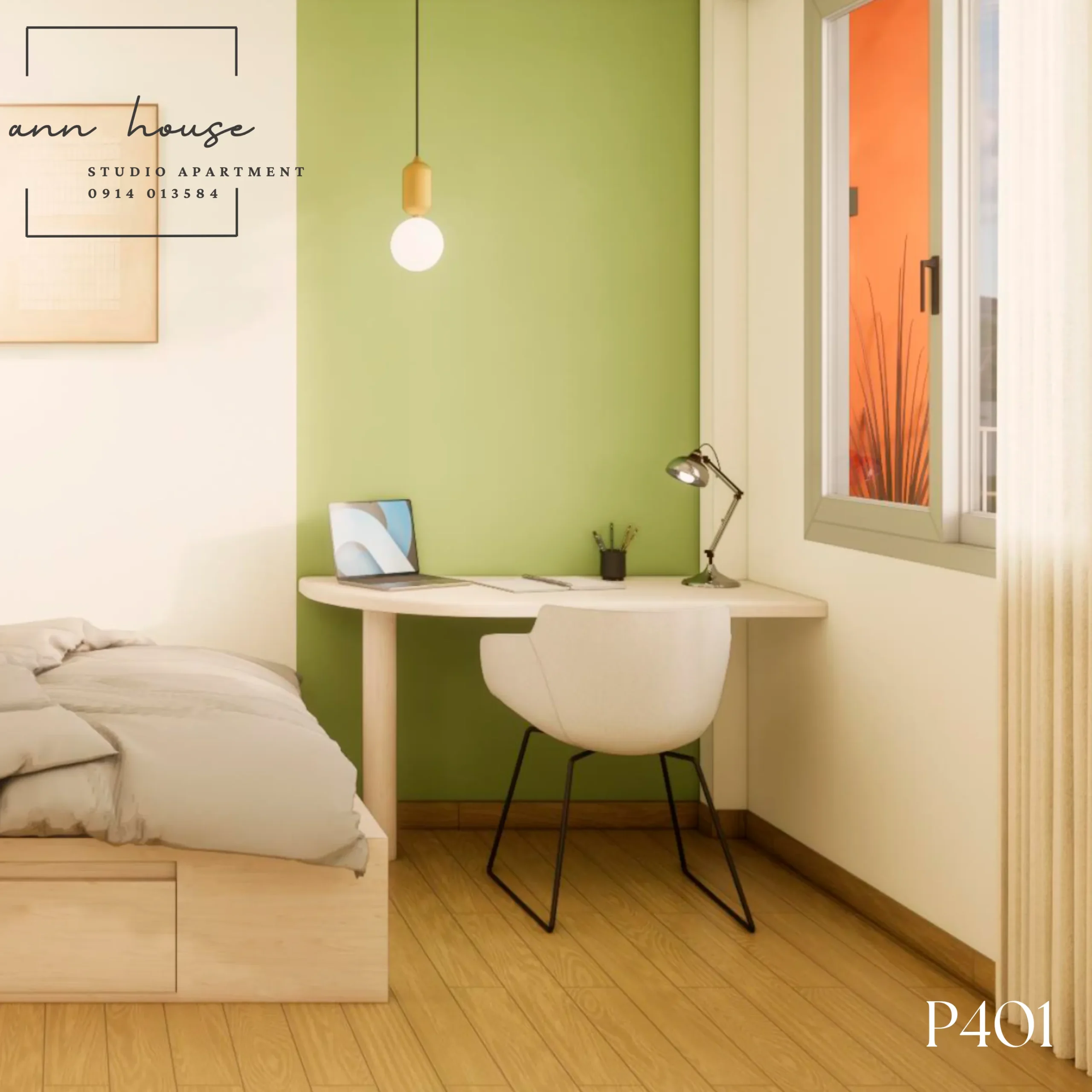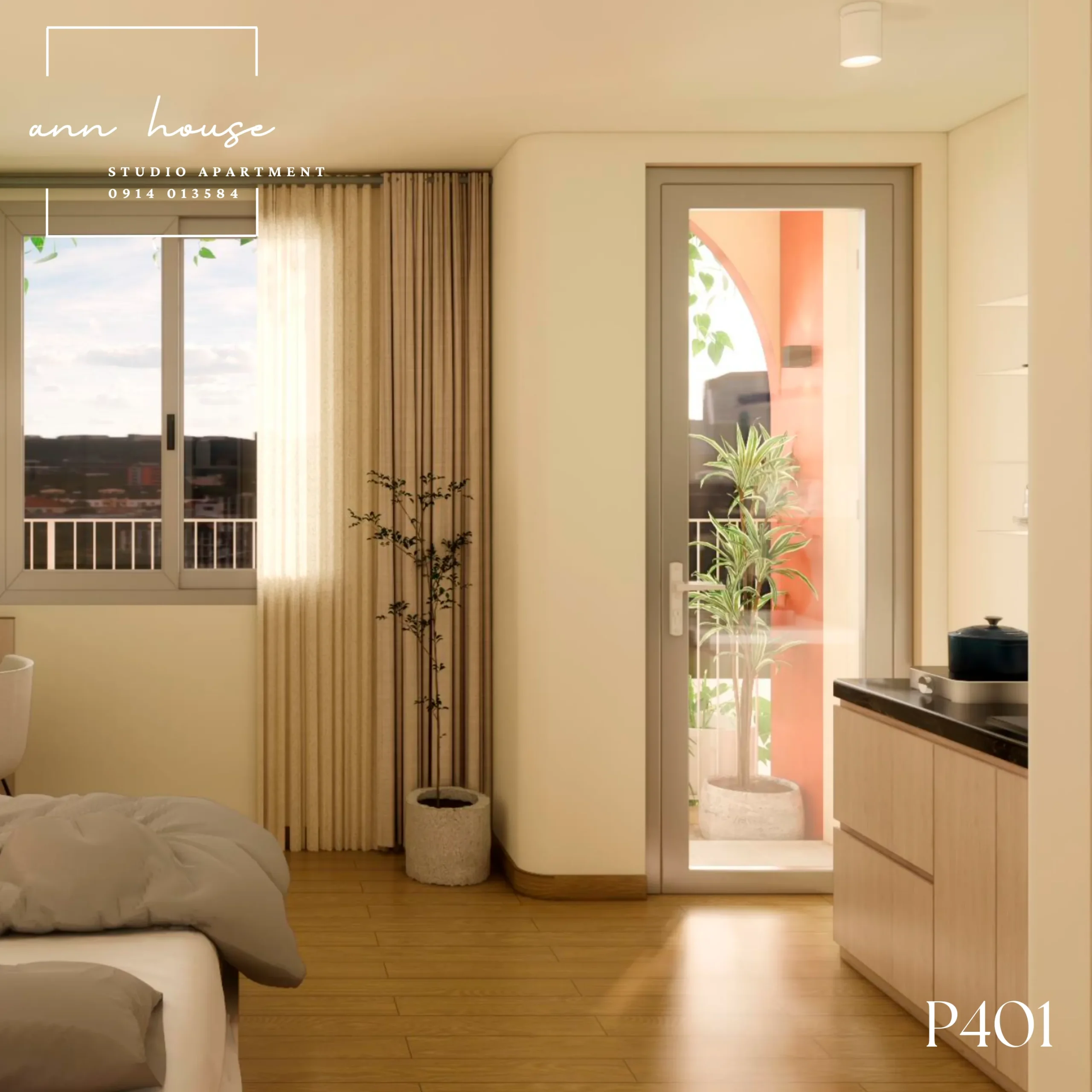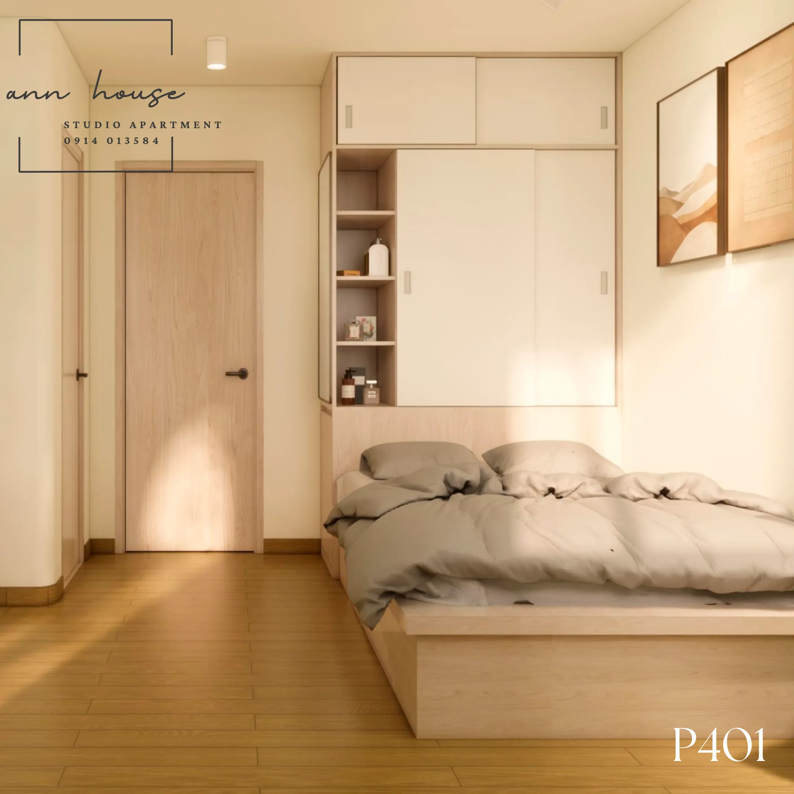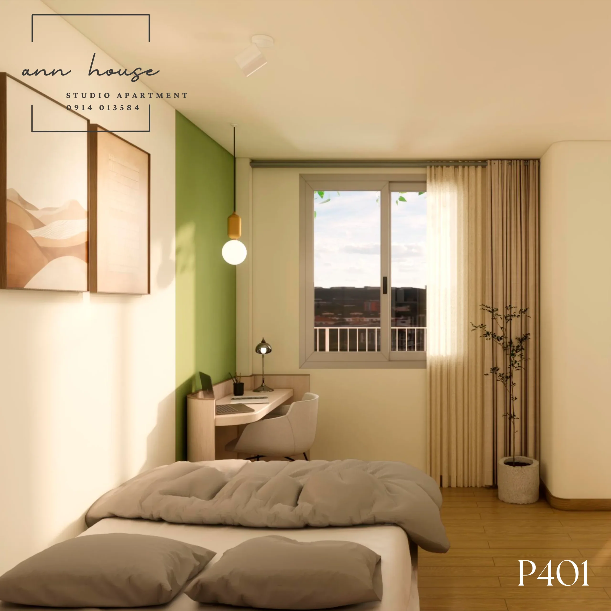 Ann House 401 là studio mang phong cách Minimalism kết hợp Scandinavian với tone màu be – gỗ và xanh lá, tạo cảm giác thư giãn và gần gũi với thiên nhiên.